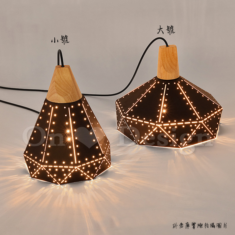 以幾何簡單的線條,採用鐵件製作,卻如摺紙般虛線設計出來的一款吊燈,搭配上溫潤的實木,剛毅中帶點趣味,也充滿溫暖,打光之後,從摺紙的縫隙透露出的燈光,更讓整個空間溫暖了起來。