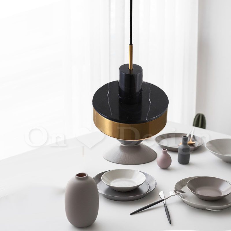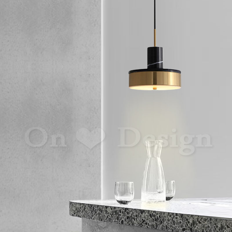 設計常常都是鑒於美國當代文化及日常生活,以及當成藝術創作之靈感。點金色澤的鐵件,搭配上簡潔造型的大理石燈罩,藉由大理石特有的紋理傳達生活的浪漫。