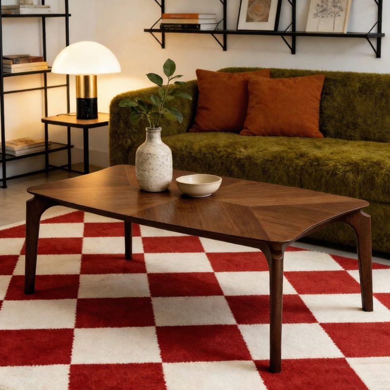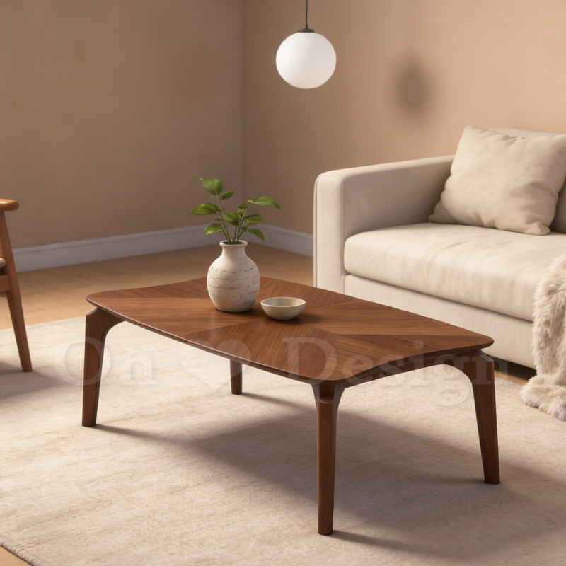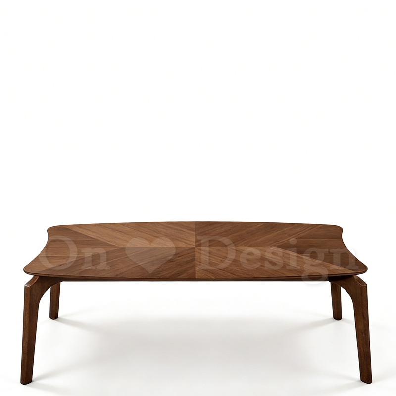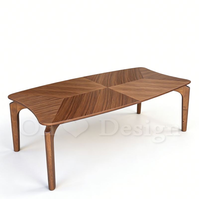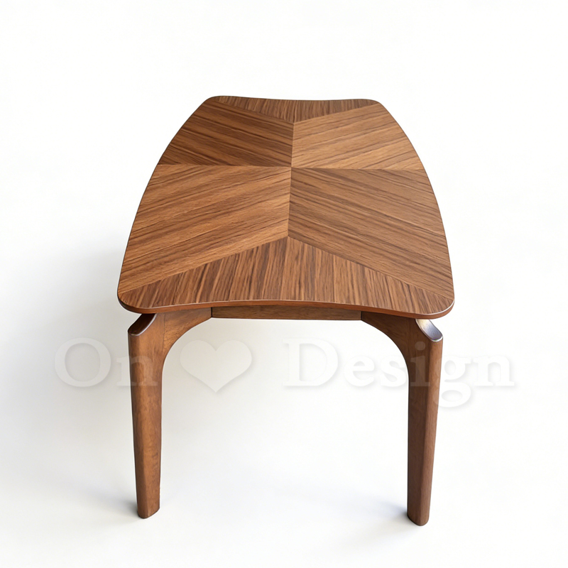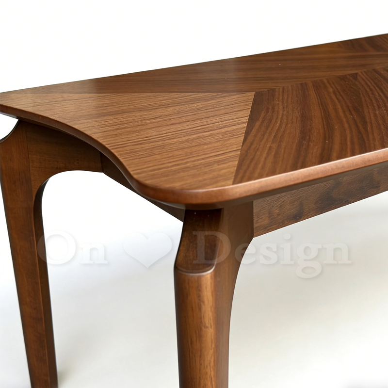 簡單的圓弧內凹的桌面造型,搭配上拼花的桌面,以及胡桃木色實木桌腳,