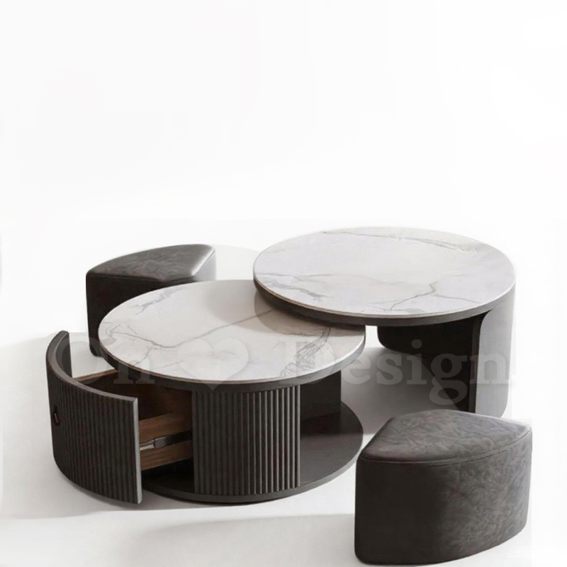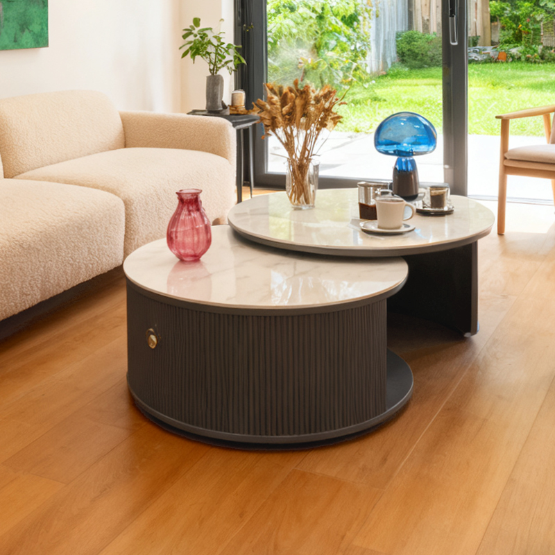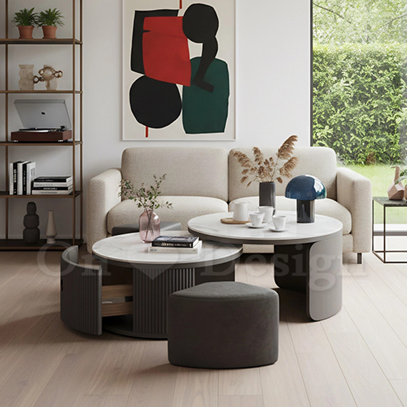 復古 美式 風格家具 燒岩桌面 貝拉 兩件式 矮凳 岩板圓形 茶几-灰色