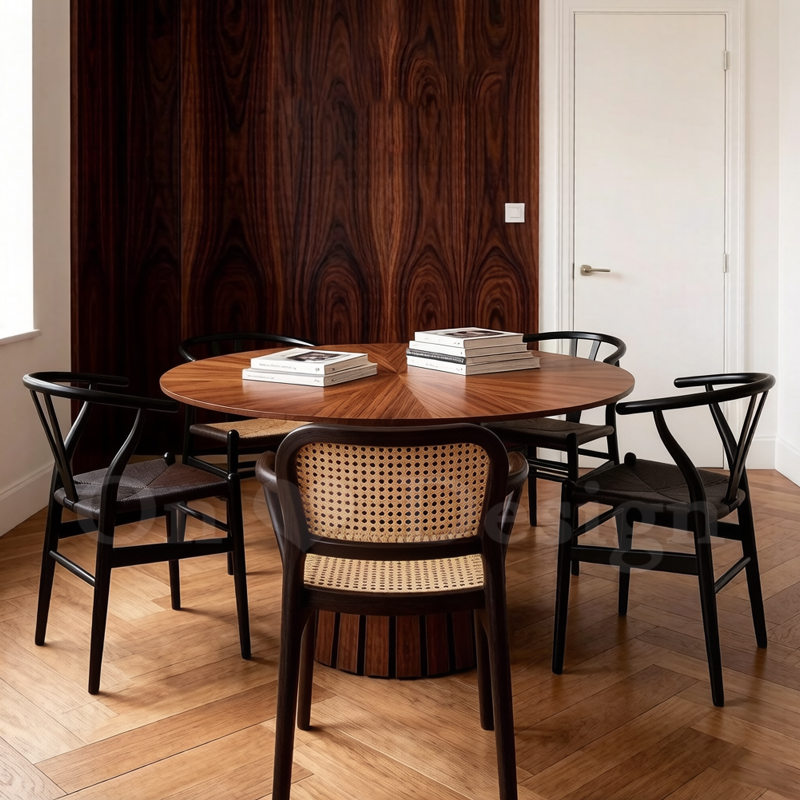 簡單的桌面造型,搭配上胡桃拼花的桌面,以及胡桃木色實木桌腳,