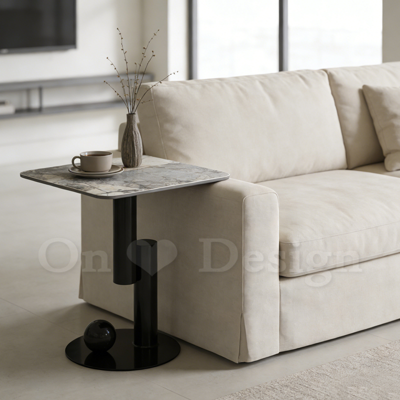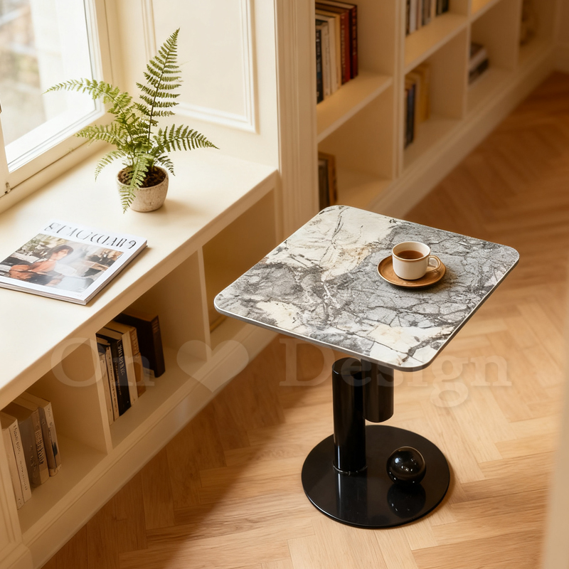 簡單的方型造型,配上鍍金的黑色球體,圓弧可愛的曲線,桌面搭配上岩板,簡單又充滿設計感。