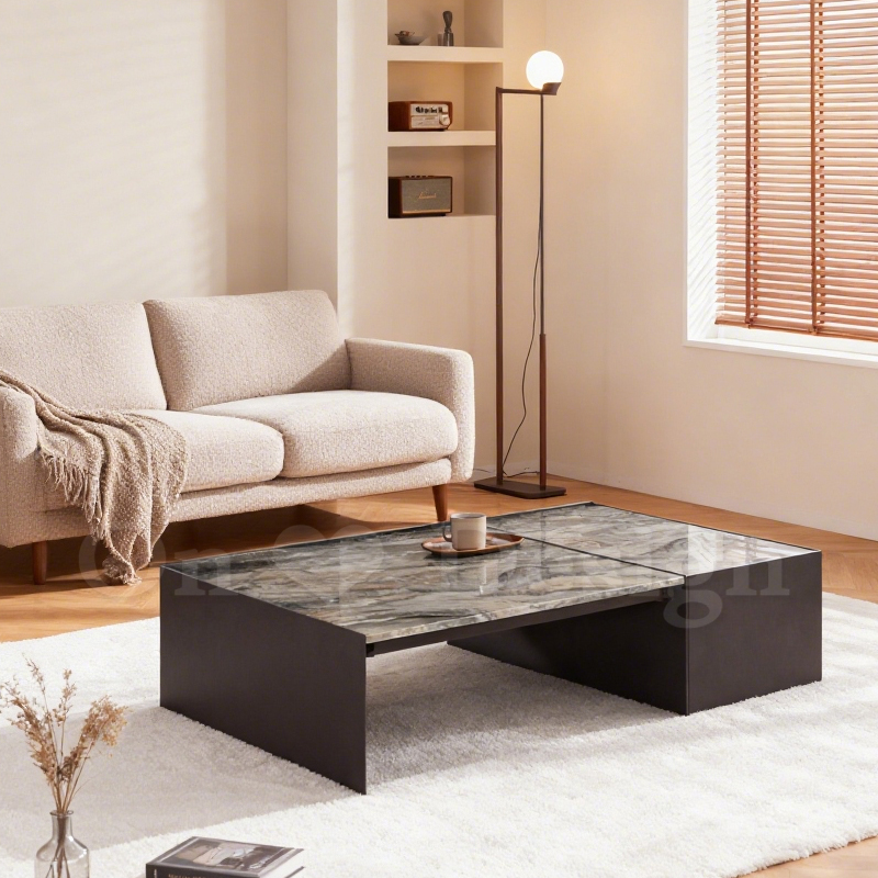 岩板特有耐磨耐高溫好打理 ,讓咖啡漬一擦乾淨,簡單打理,簡約的黑色桌腳,簡單又充滿設計感。大理石紋岩石面帶給空間不凡的高貴視覺饗宴,適合美式奢華風 簡約的客廳風格。