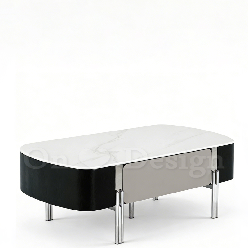 雙邊都有抽屜,灰黑白的簡約色調,搭配鍍鉻鐵腳